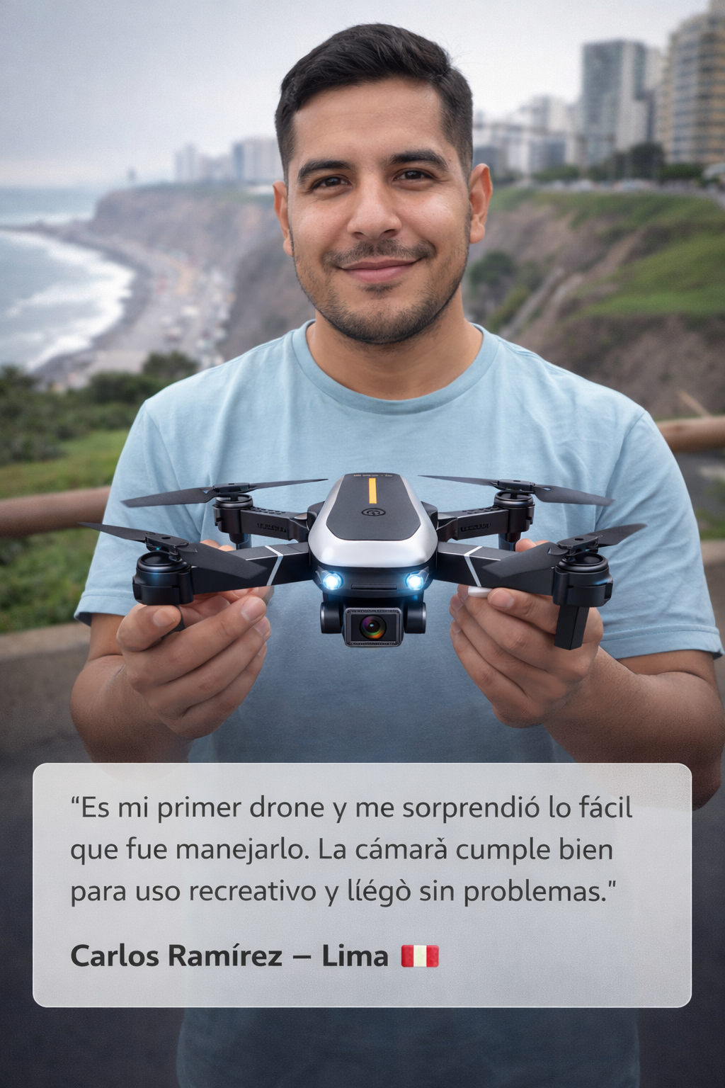 El E88 genera su propia red WiFi a la que conectas tu celular. A través de nuestra App gratuita, ves en tiempo real lo que ve el drone. Sus giroscopios de 6 ejes mantienen el equilibrio automáticamente, permitiéndote dirigirlo con el control remoto físico o desde la pantalla de tu móvil.