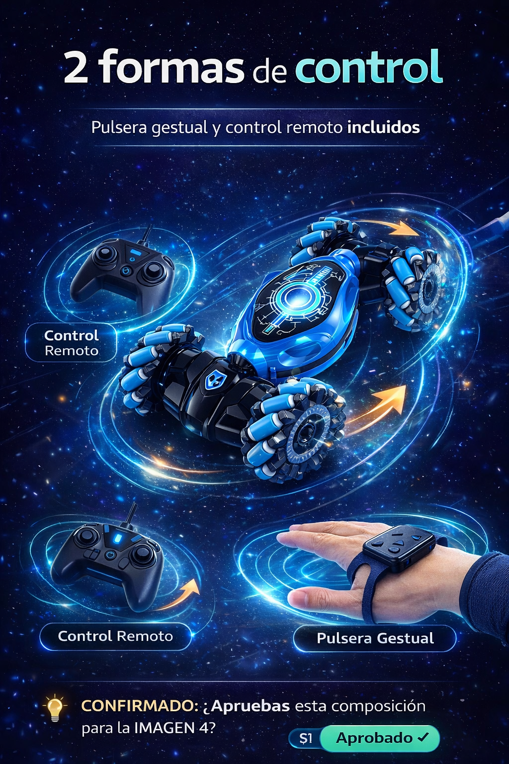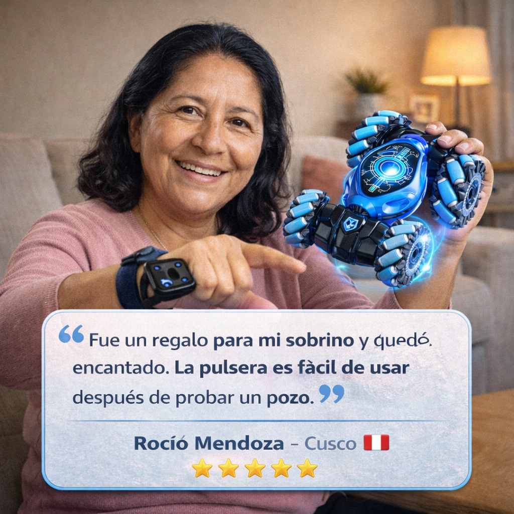 El Titan Drift utiliza un sistema de tracción 4x4 inteligente acoplado a ruedas "Mecanum" con rodillos independientes. Esto permite que el auto se desplace lateralmente (como un cangrejo) o gire sobre su propio eje sin moverse del sitio. Mediante la pulsera sensora, un giroscopio interpreta la inclinación de tu mano: si inclinas la mano abajo, el auto avanza; si la giras, el auto rota. Es una extensión de tu cuerpo.